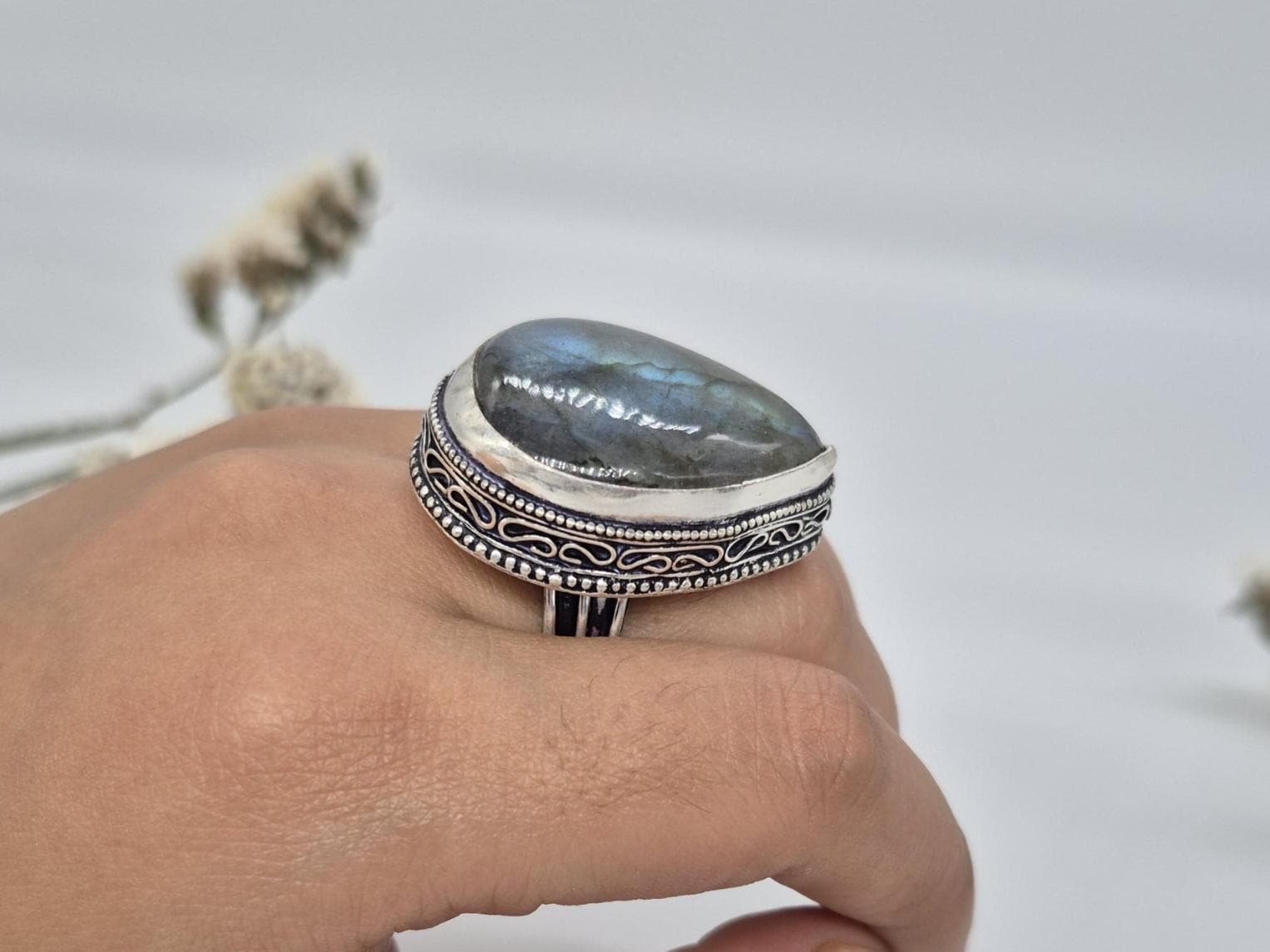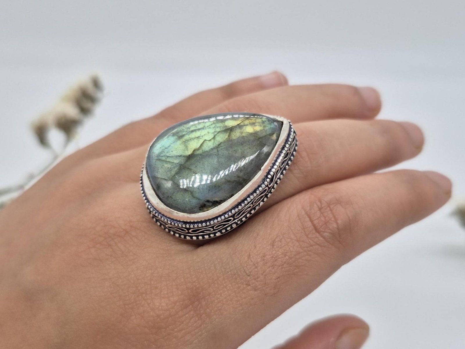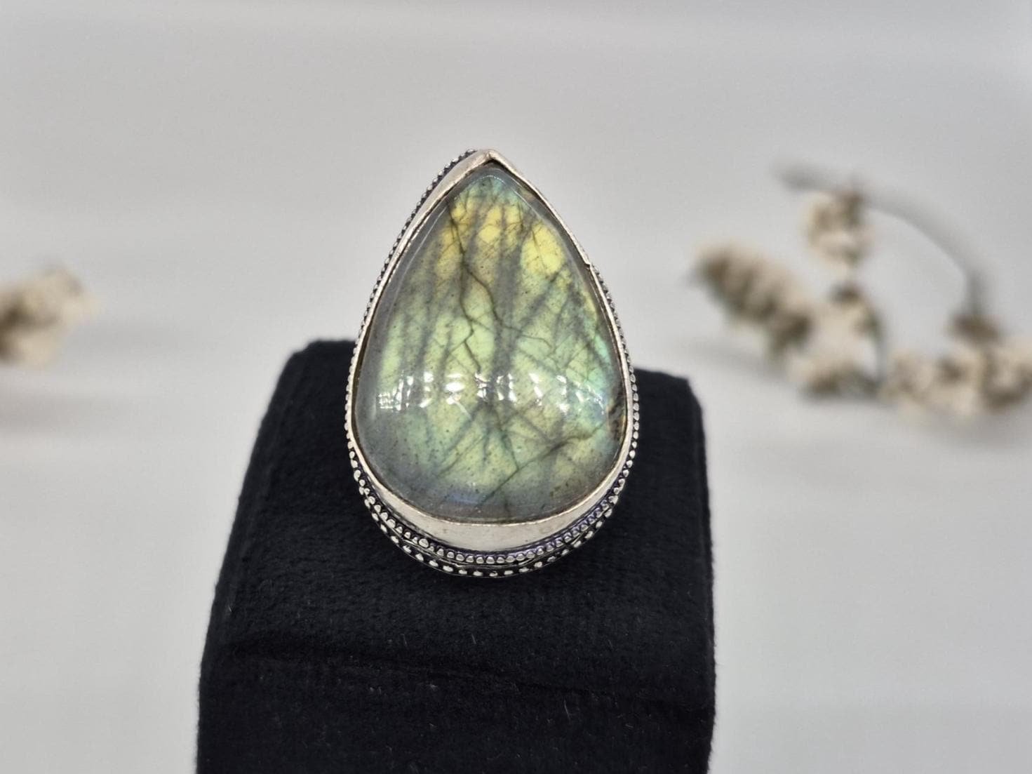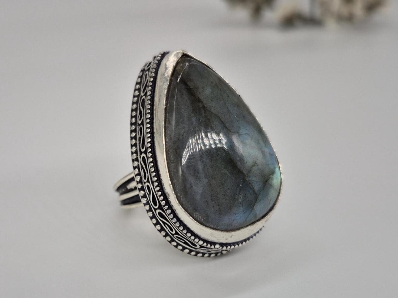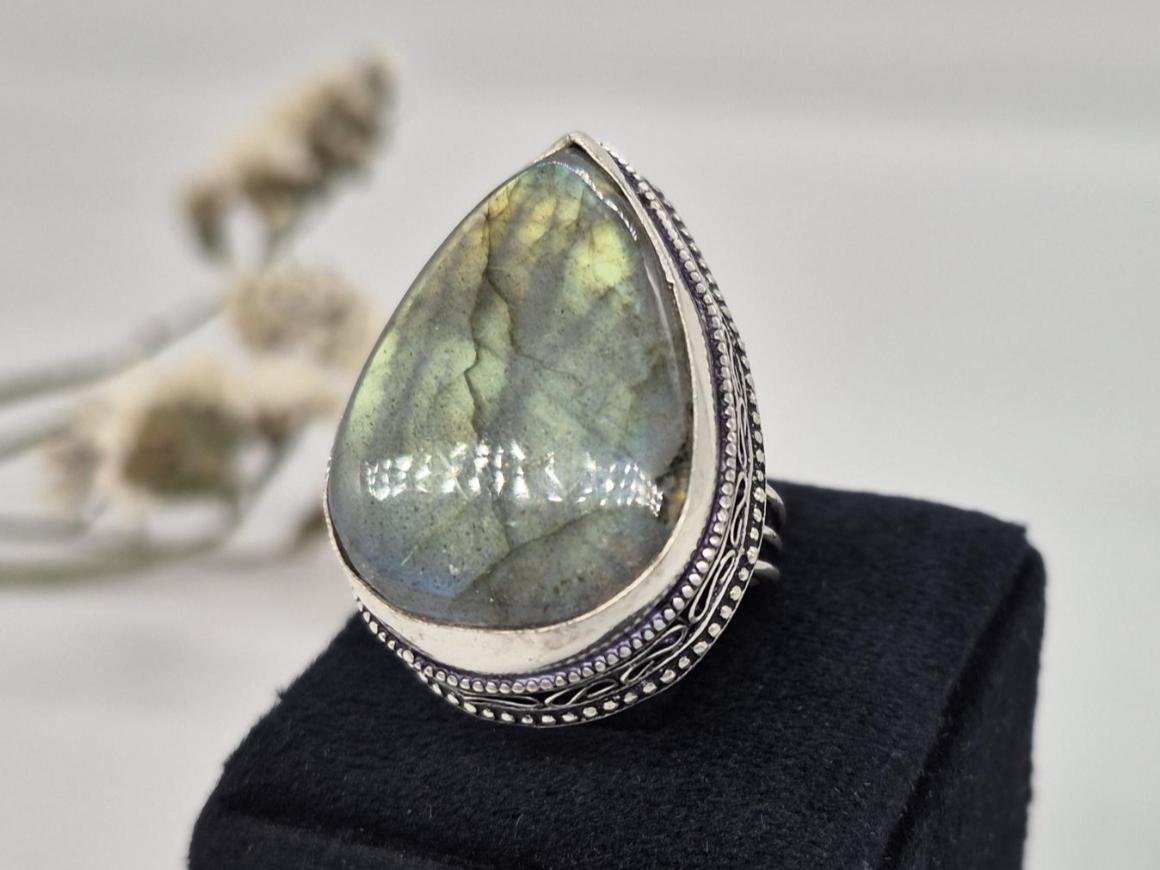 • Add a touch of mystery and elegance to your look with our Very Beautiful Labradorite Teardrop Gemstone Ring.