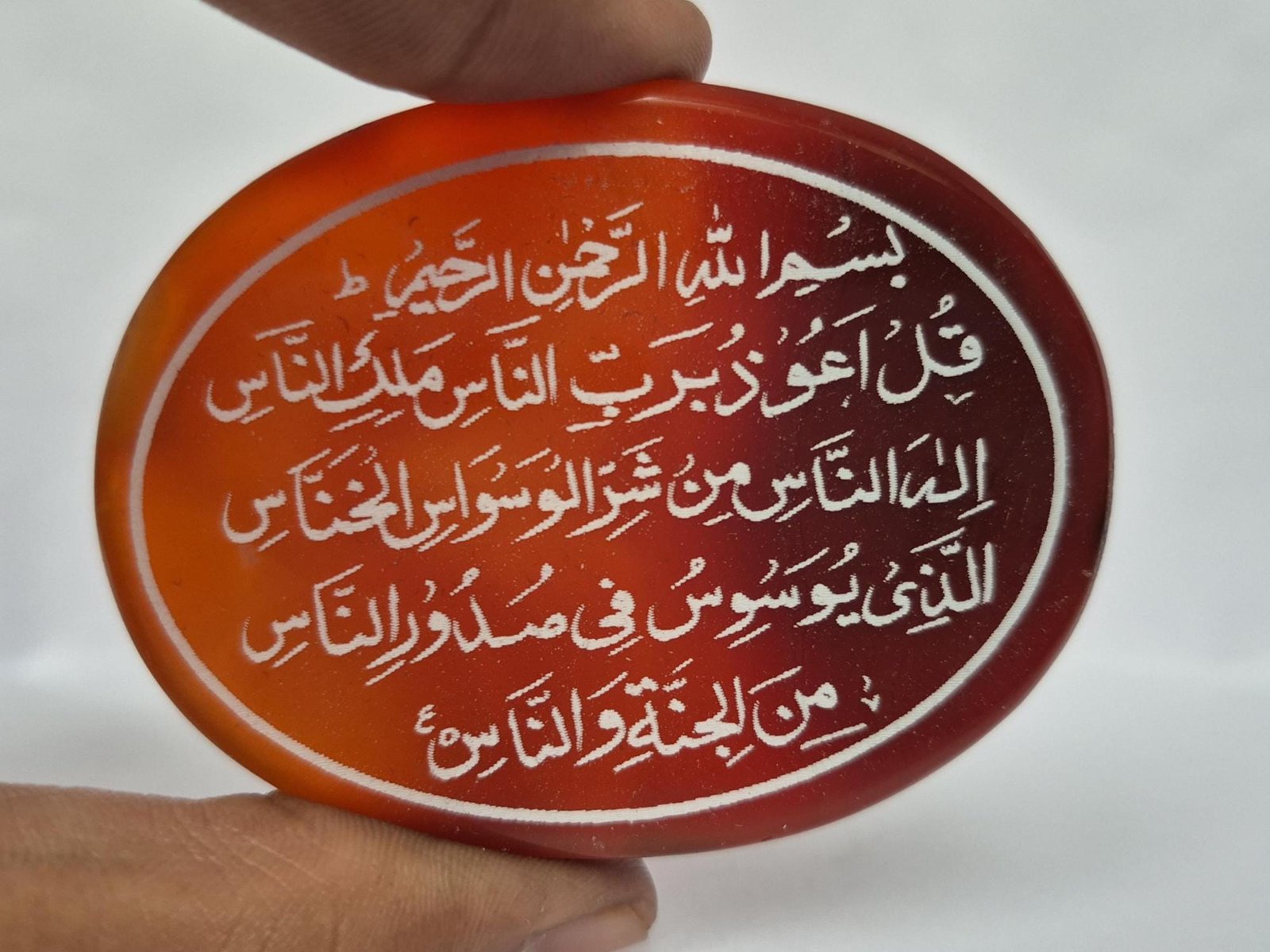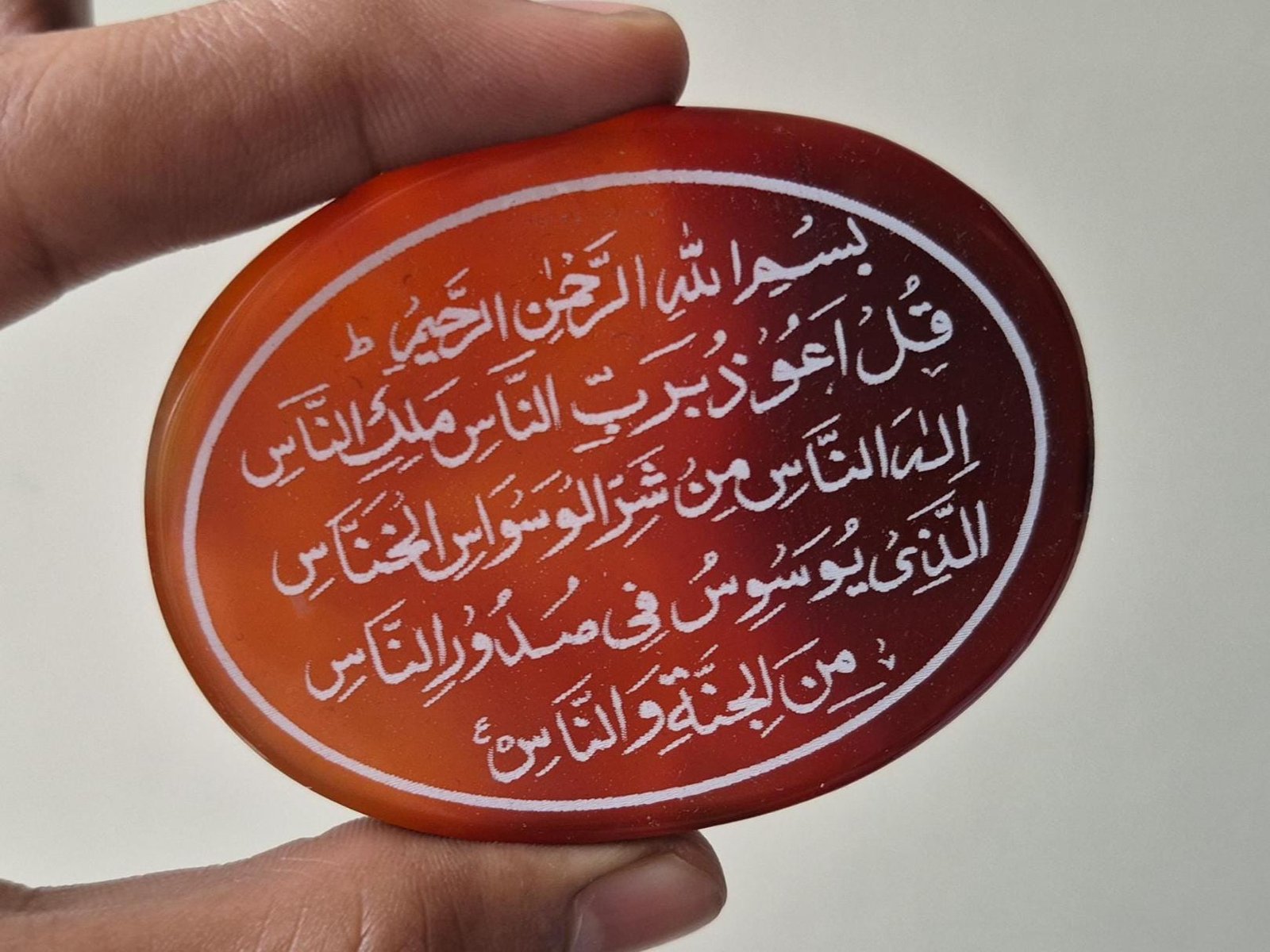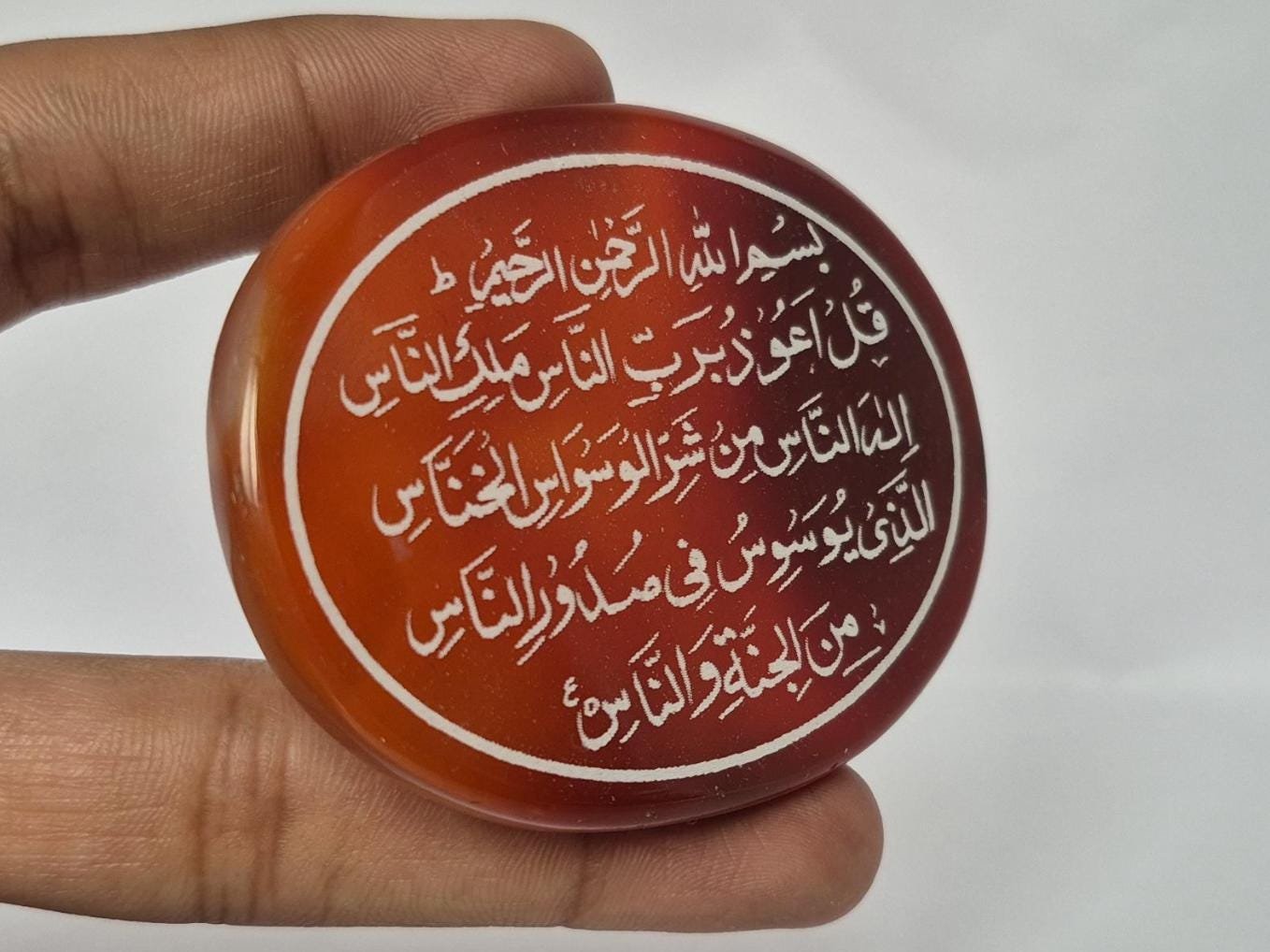 • Introducing our exquisite Islamic Aqeeq (Agate) Pendant beautifully engraved with Surah Al-Nas on a vibrant red Aqeeq stone.