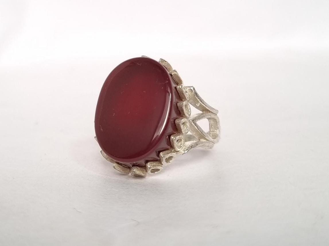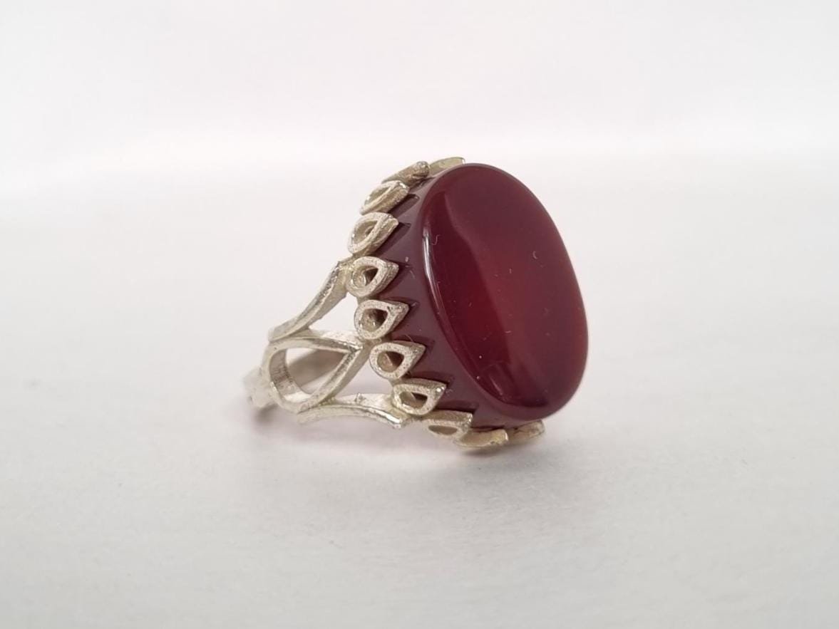 • Experience timeless elegance with our Natural Red Aqeeq (Agate) Ring set in white metal.
