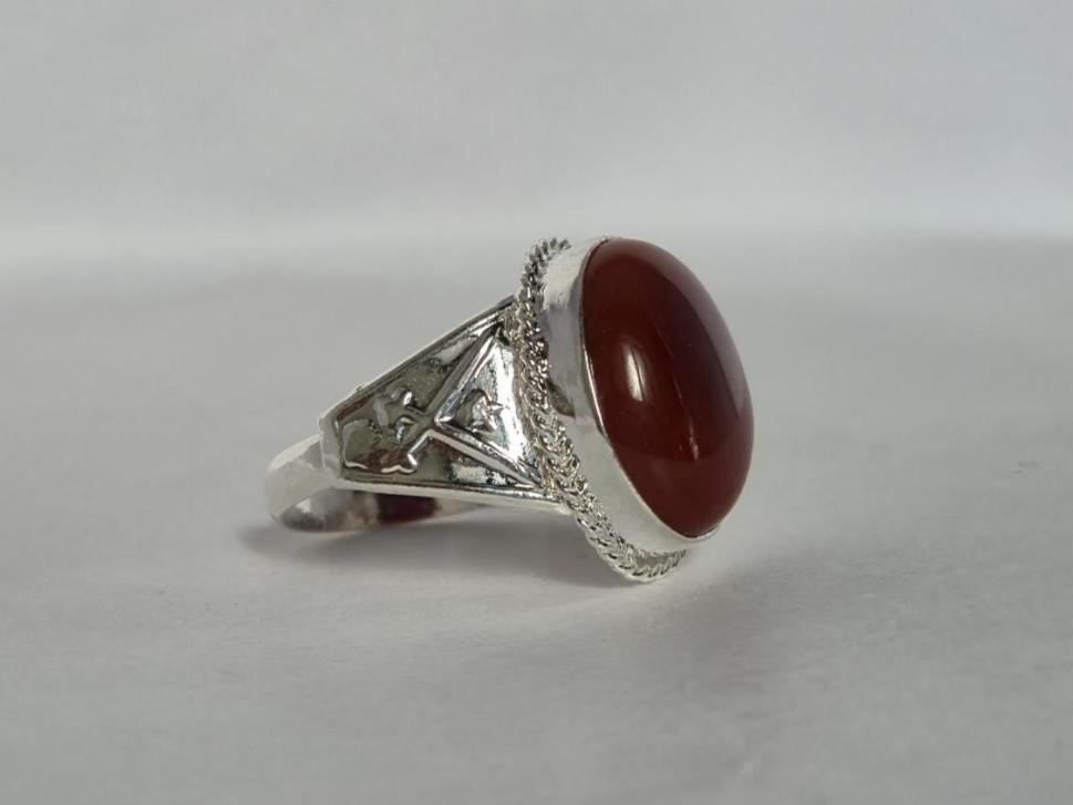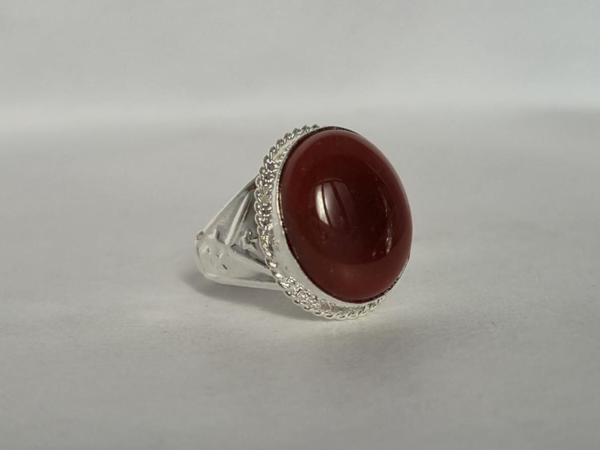 • Experience timeless elegance with our Natural Red Aqeeq (Agate) Ring set in white metal.