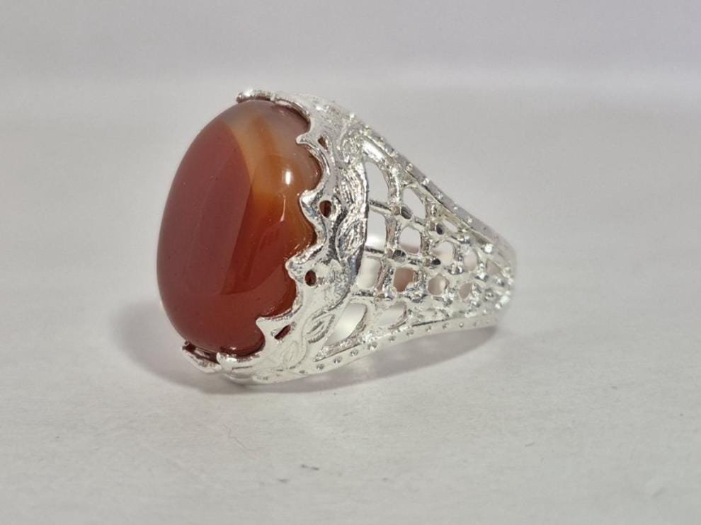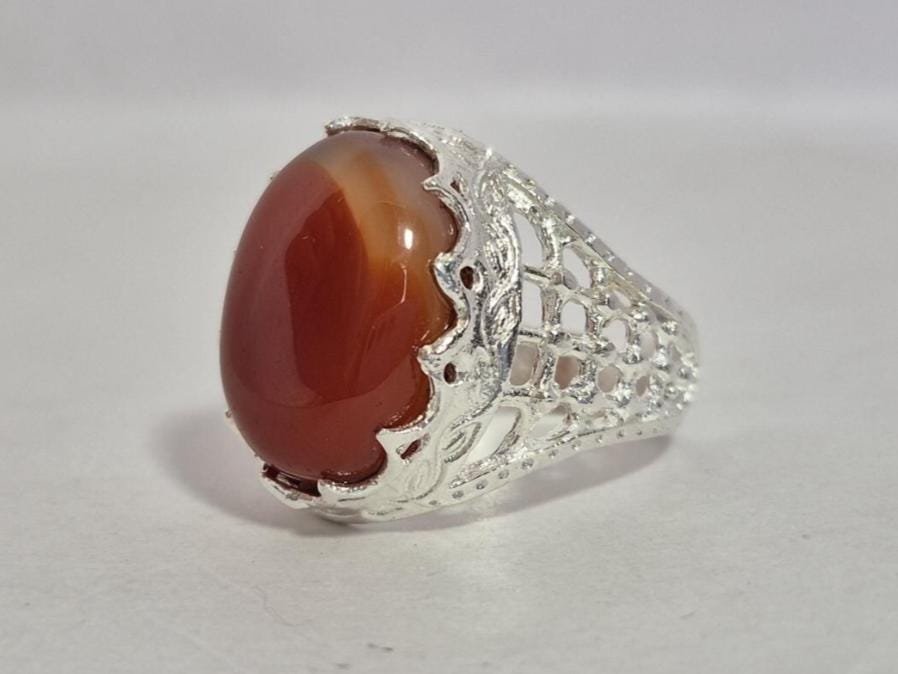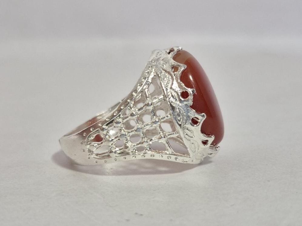 • Experience the timeless elegance of our Natural Red Aqeeq (Agate) Ring, beautifully set in premium White Metal